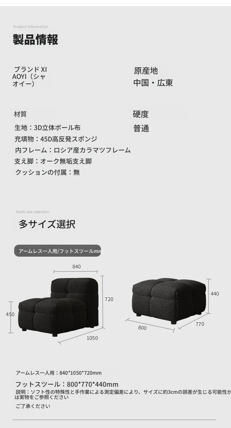| サイズ | 1人掛けソファー, オットマン | ||