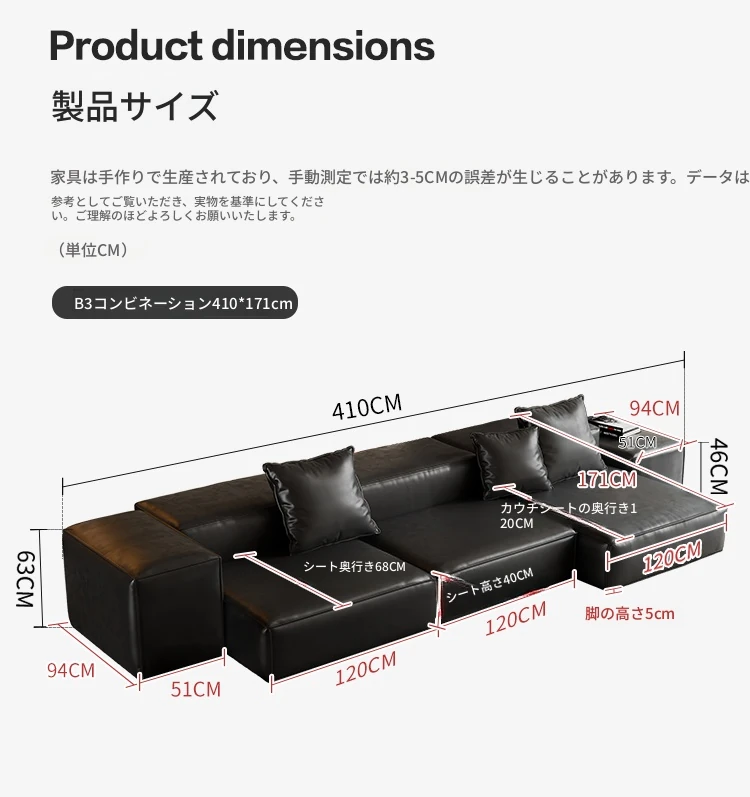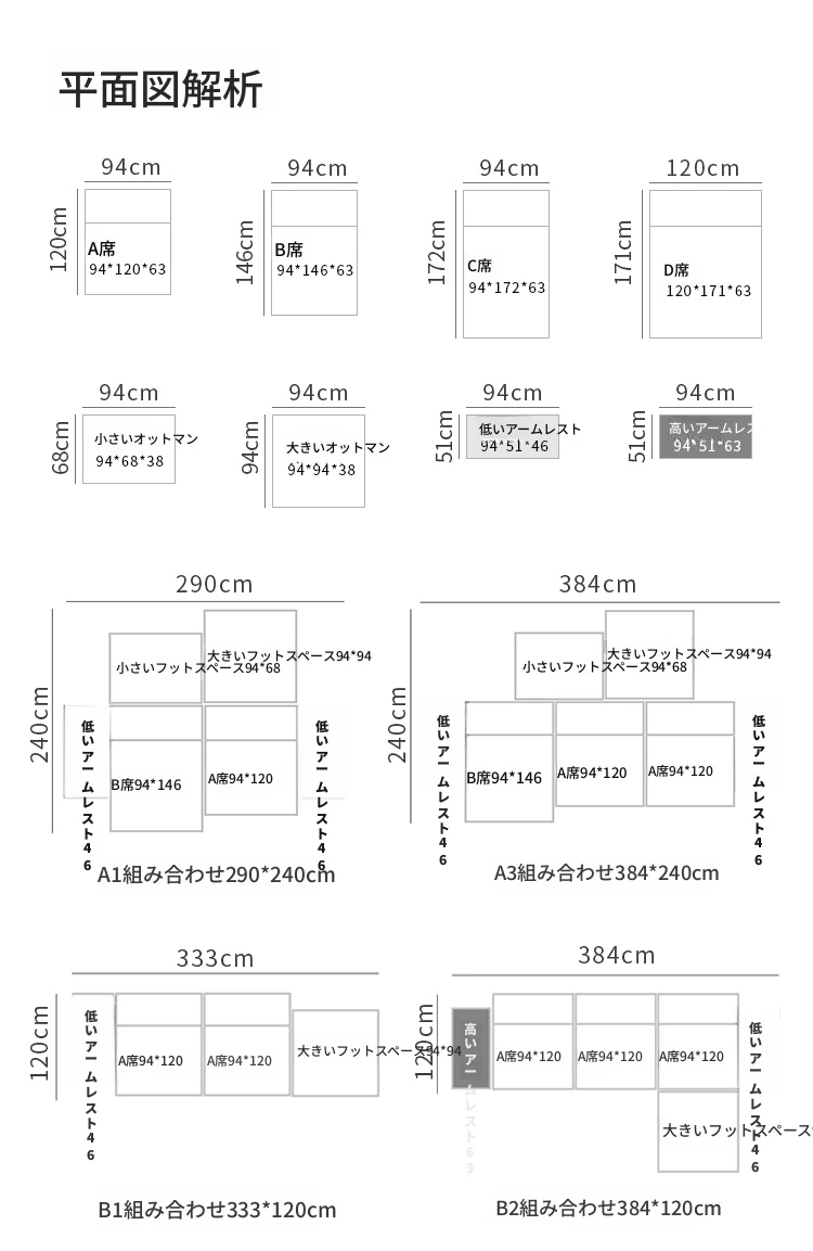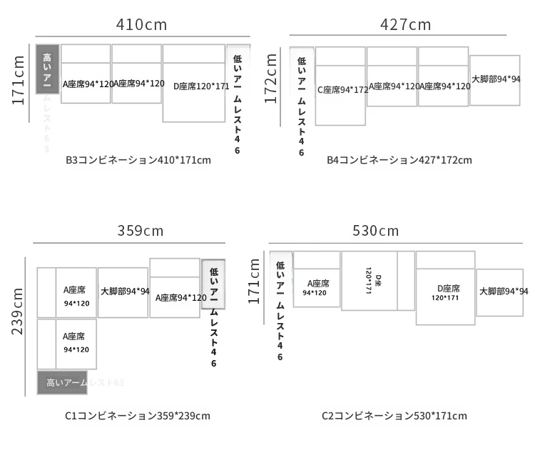 | サイズ | 幅120cmソファー, 幅146cmソファー, 幅172cmソファー, 幅68cmオットマン, 幅94cmオットマン, 高46cm肘掛け, 高63cm肘掛け | ||