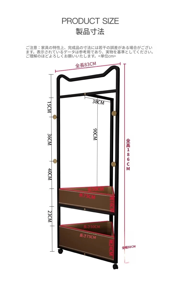 | 梱包 | 83cm: 梱包1: 幅 90.0cm×奥行き 65.0cm×高さ 190.0cm 22.0kg | ||
