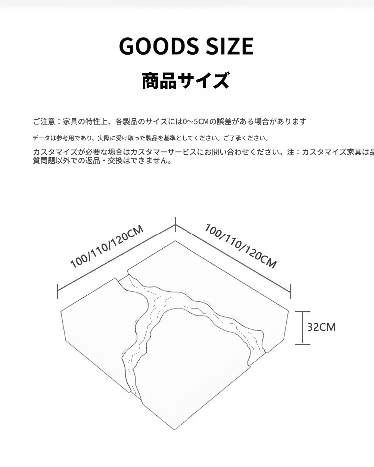 | 梱包 | 100cm: 梱包1: 幅 101.0cm×奥行き 101.0cm×高さ 35.0cm 60.0kg 130cm: 梱包1: 幅 131.0cm×奥行き 131.0cm×高さ 35.0cm 65.0kg | ||