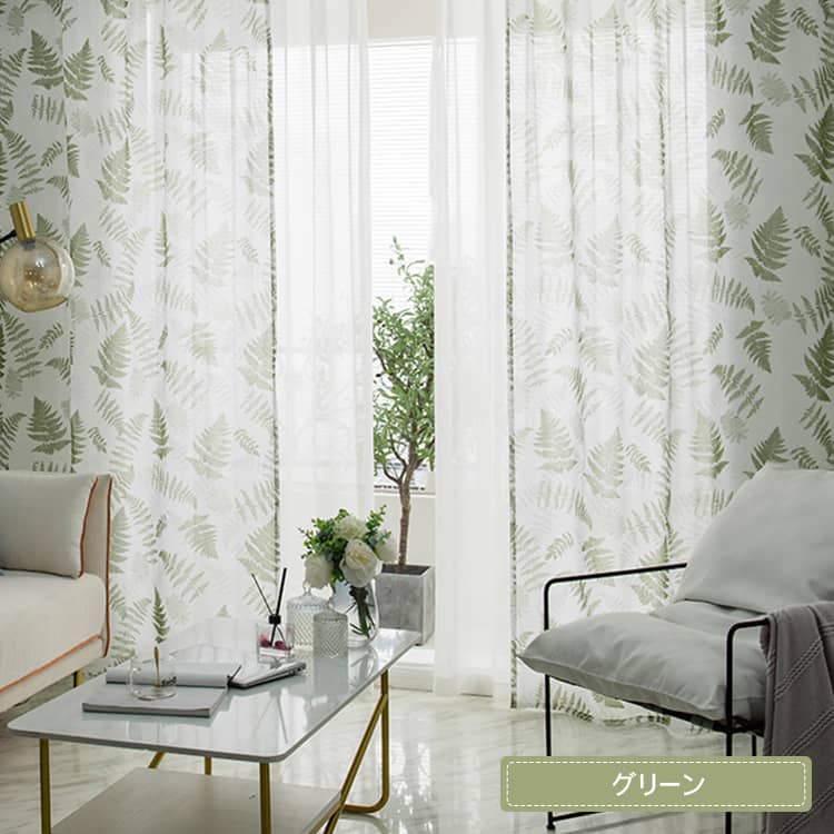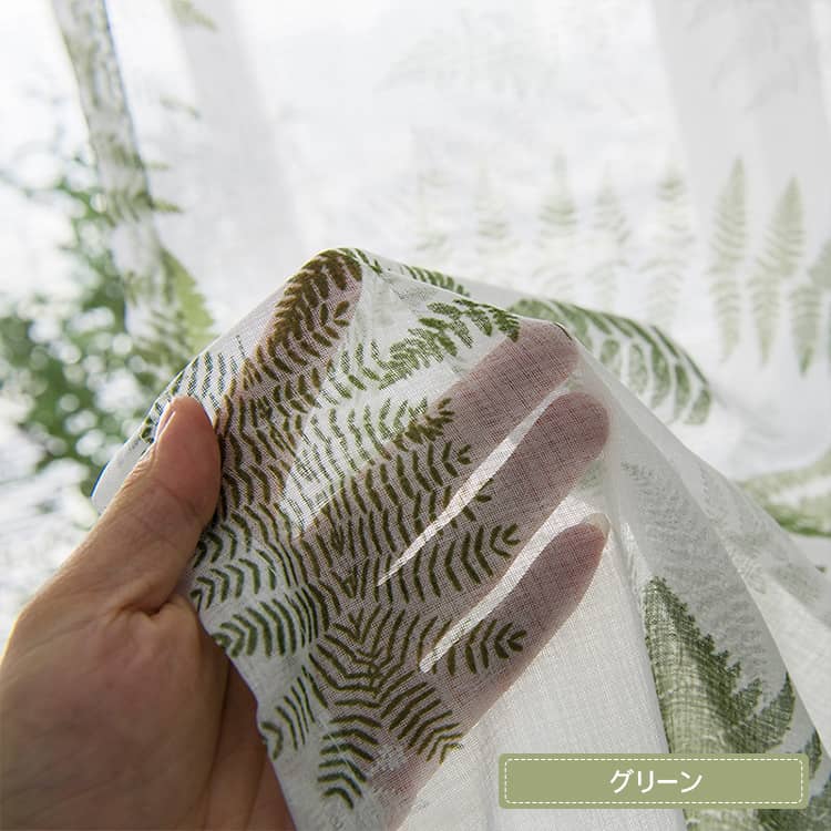透け感が美しい生地にシダモチーフをプリントしましたレースカーテン。