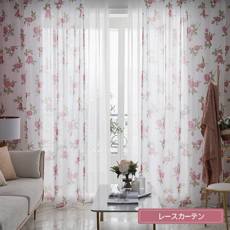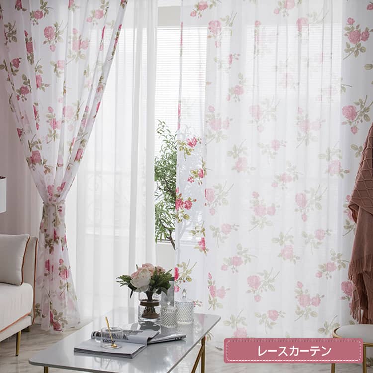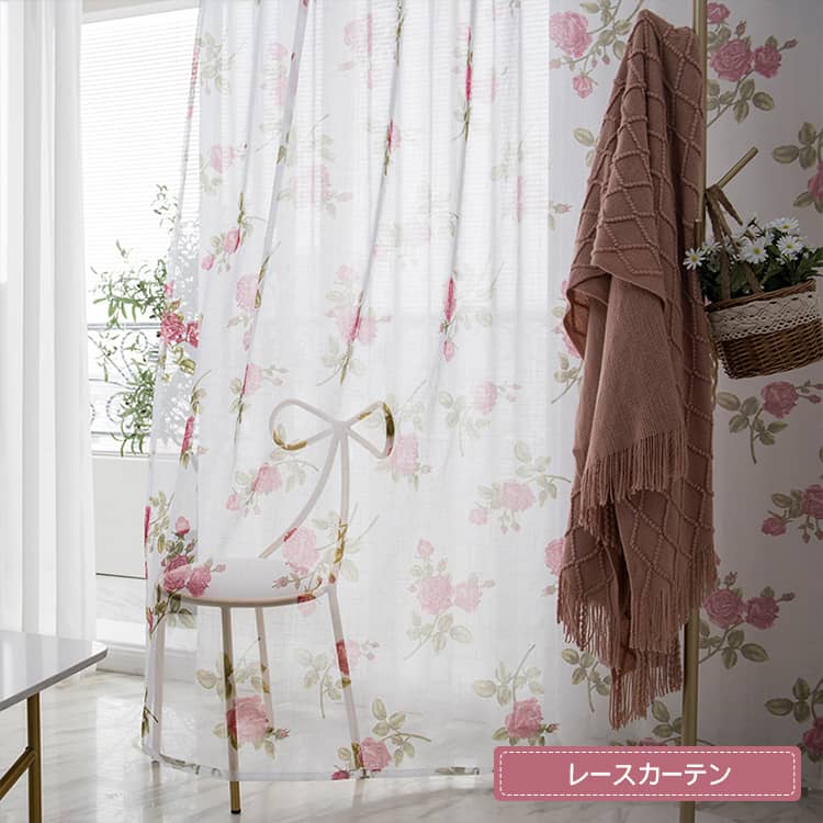 繊細なタッチで描かれたバラの花をプリントされたレースカーテン。