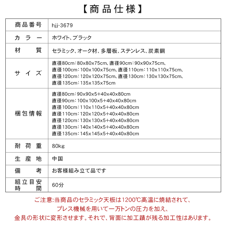 梱包1: 幅 120.0cm×奥行き 120.0cm×高さ 5.0cm 49.0kg 梱包2: 幅 40.0cm×奥行き 40.0cm×高さ 80.0cm 12.0kg 120cm: