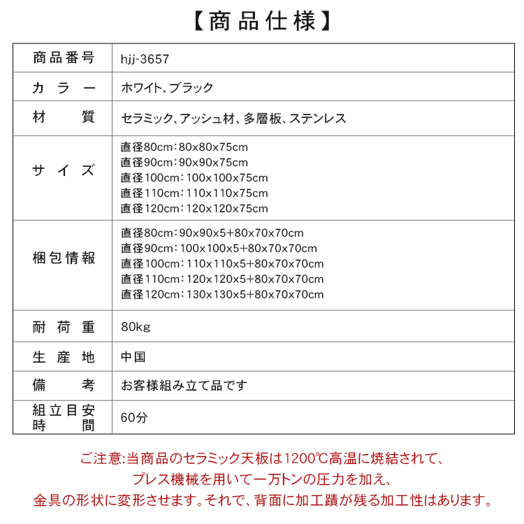 直径80cm, 直径90cm, 直径100cm, 直径110cm, 直径120cm  |