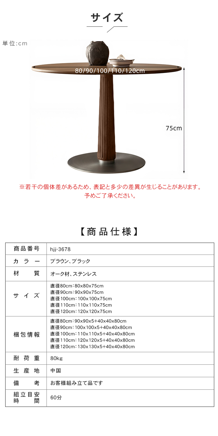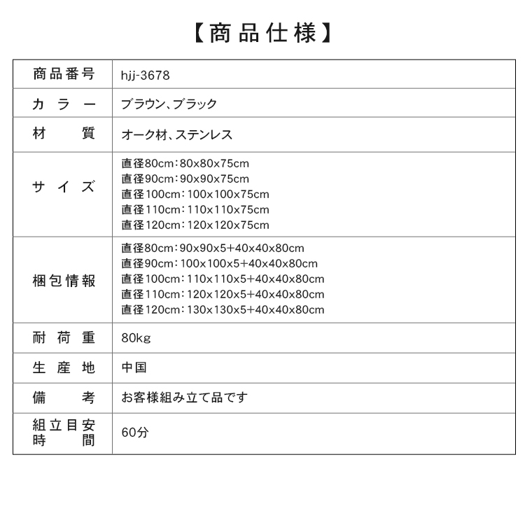 梱包1: 幅 120.0cm×奥行き 120.0cm×高さ 5.0cm 38.0kg 梱包2: 幅 40.0cm×奥行き 40.0cm×高さ 80.0cm 12.0kg 120cm: