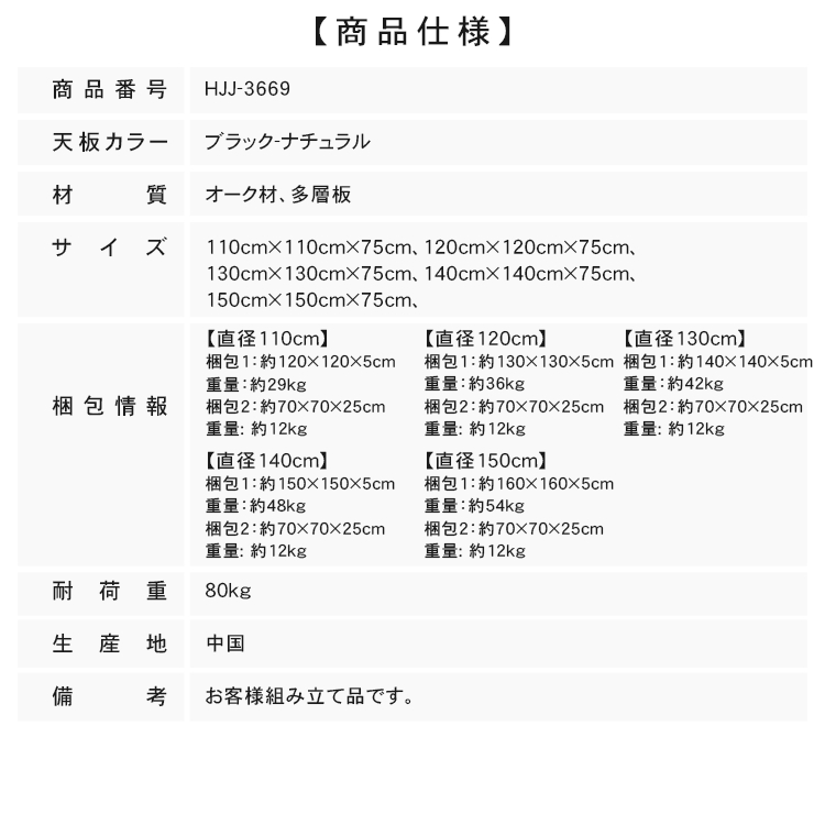 直径110cm, 直径120cm, 直径130cm, 直径140cm, 直径150cm |