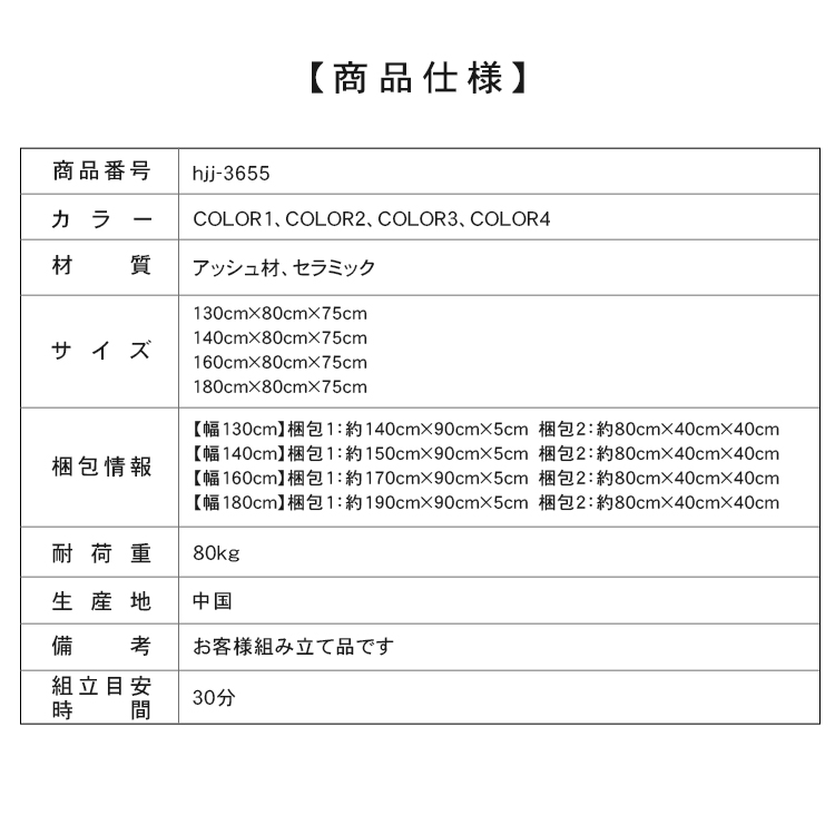 130×80×75cm ナチュラル脚, 130×80×75cm チェリー色脚, 140×80×75cm ナチュラル脚, 140×80×75cm チェリー色脚, 160×80×75cm ナチュラル脚, 160×80×75cm チェリー色脚, 180×80×75cm ナチュラル脚, 180×80×75cm チェリー色脚 |