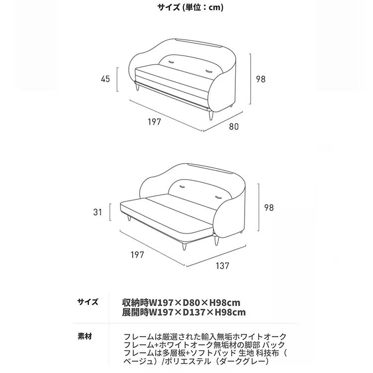 | 梱包 | 199cm: 梱包1: 幅 205.0cm×奥行き 86.0cm×高さ 104.0cm 45.0kg | ||