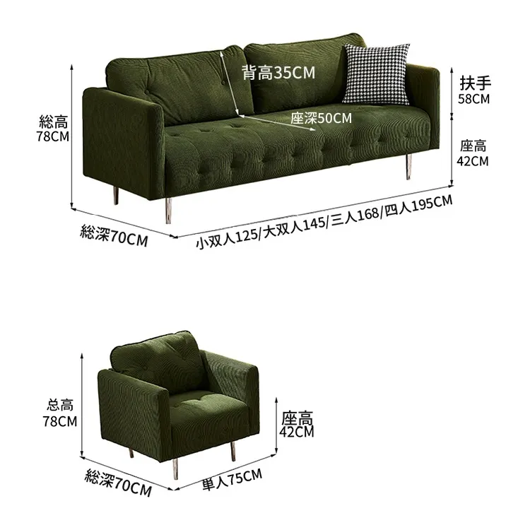 1人掛け 幅75cm, 2人掛け 幅125cm, 2人掛け 幅145cm, 3人掛け 幅168cm, 4人掛け 幅195cm |